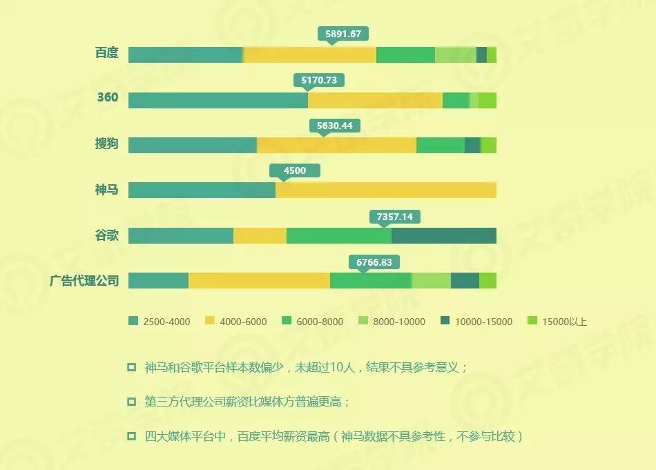 国内四大媒体平台中,百度平均薪资最高,搜狗薪资高过360,神马和谷歌平台样本数偏少,未超过10人,结果不具参考意义。