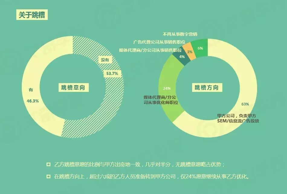 乙方跳槽意愿的比例,与甲方出奇地一致,都是对半分,而不跳槽略胜于跳槽。在跳槽方向上,超过六成的乙方人员准备转向甲方公司,仅24%愿意继续从事乙方优化。