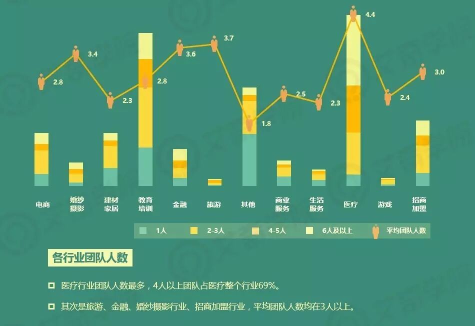 团队平均人数最多的行业,毋庸置疑是医疗行业,平均团队人数为4.4人,69%的医疗团队有4个人以上。而稍次之的是旅游、金融、婚纱摄影和招商加盟,平均团队人数在3人以上。平均团队人数低于2的,只有除上榜行业以外的其他行业。