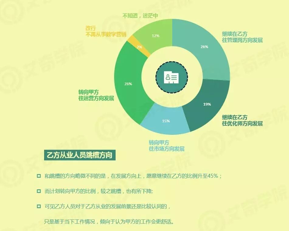 而对比上下图,我们发现发展方向上,愿意继续在乙方的比例有45%,远高于跳槽方向中的24%。我们猜测,乙方人员对于乙方从业的发展前景还是比较认同的,只是基于当下的工作情况来说,他们倾向于认为甲方的工作会更加舒适。