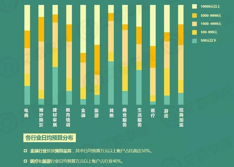 金融行业平均投放预算最高,其中日均预算万元以上账户占比高达50%;医疗和旅游行业日均预算万元以上账户占行业40%。而电商行业的日预算分布非常均匀,万元以上账户的占比相对不多,但薪资偏高,可见薪资和账户预算并无明显的直接关系。