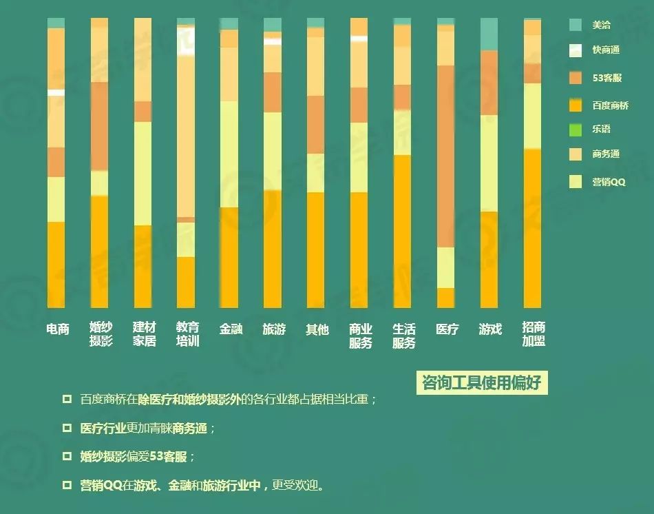医疗行业过半机构选择商务通,而53客服在婚纱摄影行业也有压倒性的优势。教育行业对咨询工具的选择比较多样化,各工具分布较均衡。除了医疗、婚纱摄影,和分布比较均匀的教育、游戏行业,百度商桥在余下的行业中,都占据相当比重,尤其是建材家居和其他行业。而营销QQ在游戏、金融和旅游行业中,受到的青睐对于余下的行业。