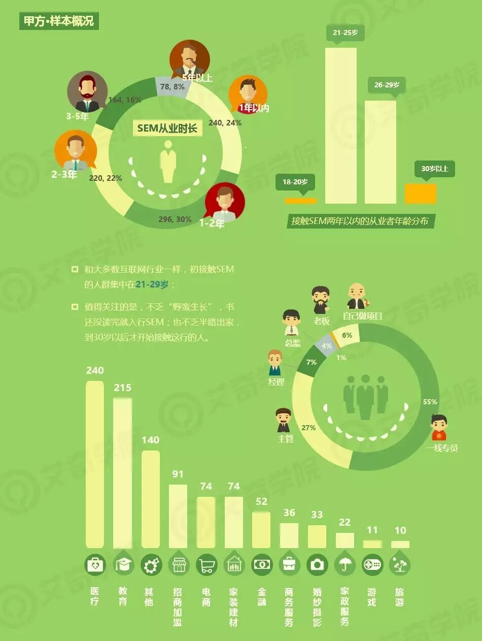 其中男女总比例为2:1,SEM行业中男女数量差异不会太大,但男性数量还是占优势,占总体三分之一。