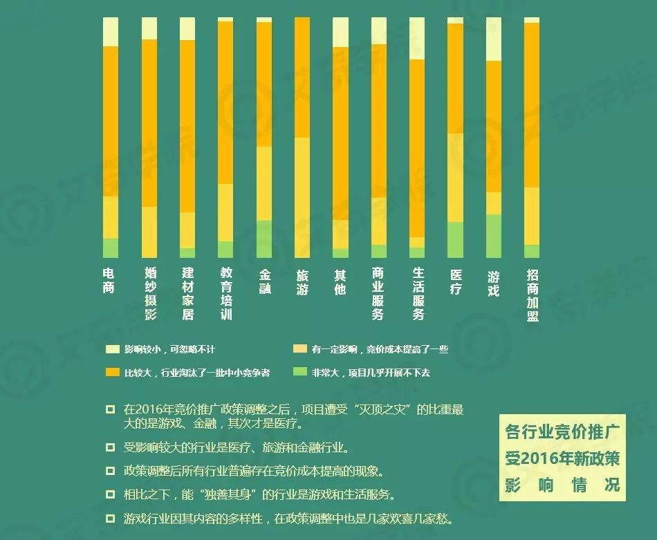 在竞价推广政策调整之后,项目遭受“灭顶之灾”的比重最大的是游戏、金融,其次才是医疗;受影响较大,淘汰了一批中小竞争者的占比较大的行业分别是医疗、旅游和金融行业;所有行业普遍存在调整后竞价成本提高的现象;相比之下,能“独善其身”的行业是游戏和生活服务。