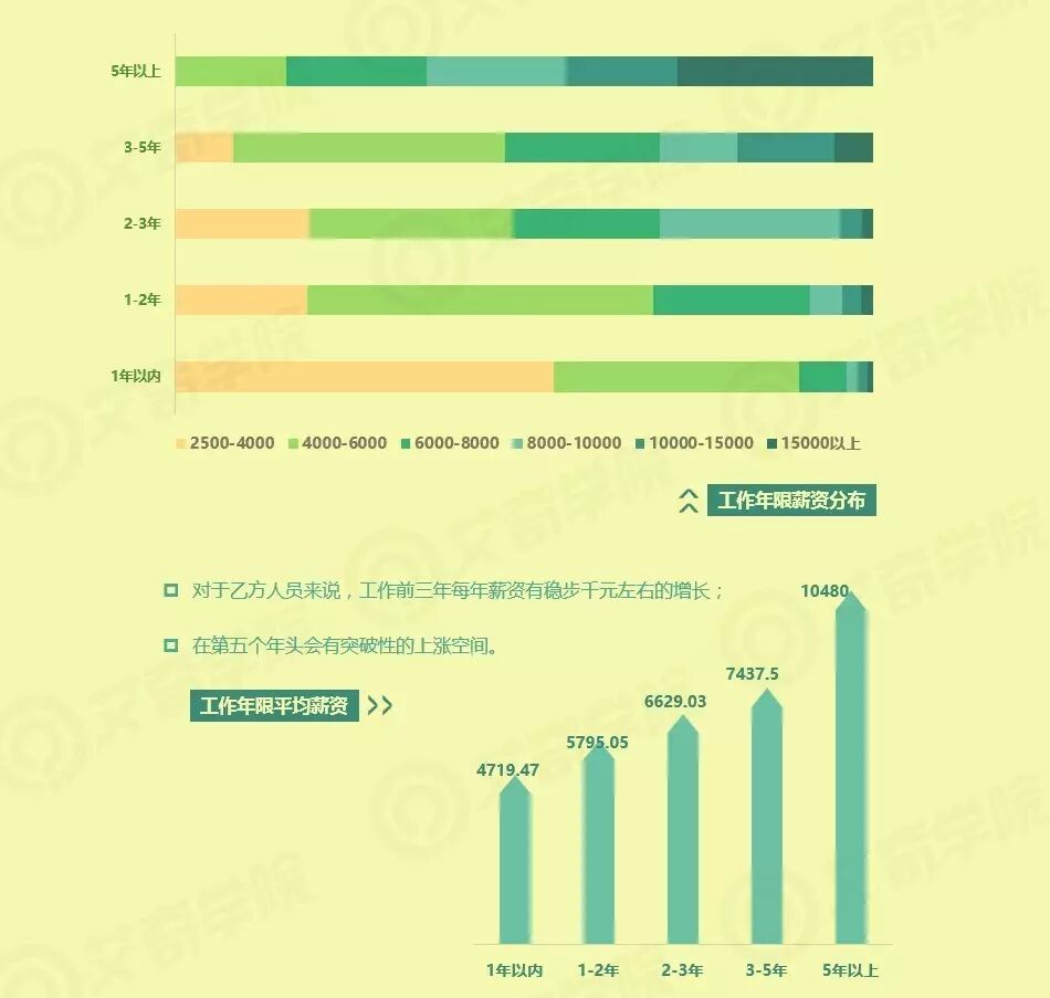 不同于甲方的是,对于乙方人员来货,工作前三年,每年薪资都会有稳定在千元左右的增长,但是在第五个年头会有突破性的上涨。乙方人员可谓“酒越陈越香”,需要经验和资历的积累。