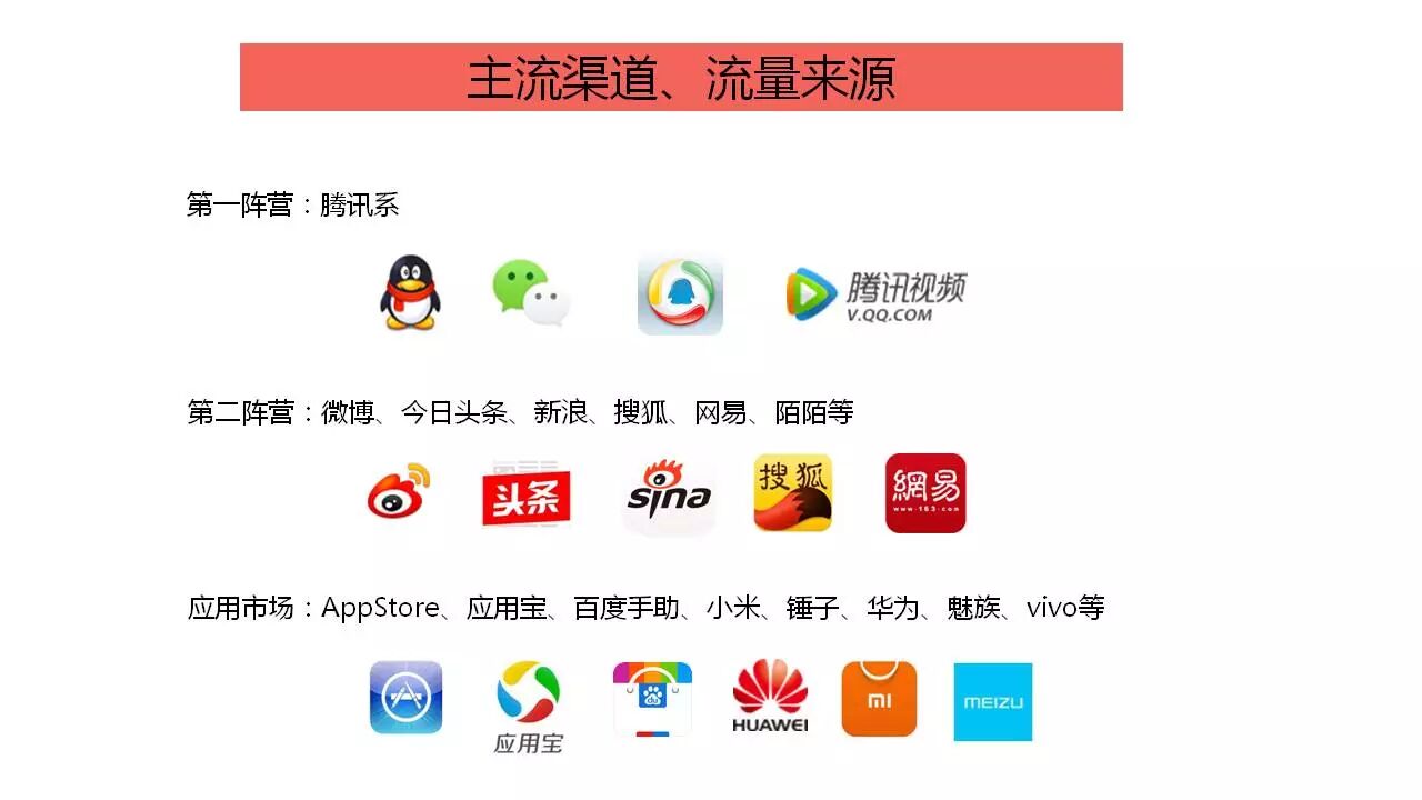 小编将主流渠道流量来源分为了三大阵营,第一阵营是腾讯系,腾讯是目前用户量最大的头部流量,它包括了QQ微信还有腾讯新闻,腾讯视频等腾讯系的资源。
