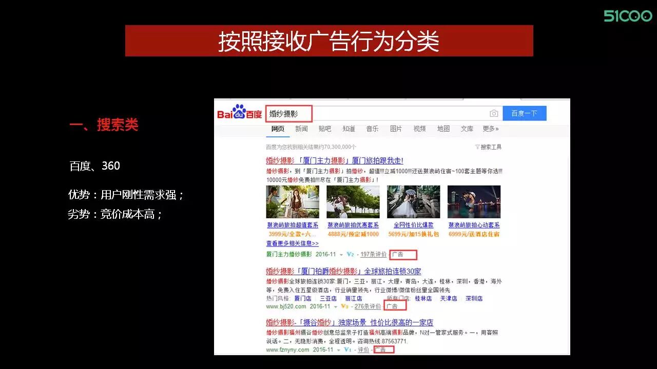这里有一个问题,比如我可能花了很多钱去竞价“婚纱摄影”这个关键词的搜索排名,那么百度里看到的前五页或前十页都是带有广告字样的,从用户体验的角度去看,心态肯定是从第一页一直点到第五甚至第十页去比较每一个商家之间的优劣势。