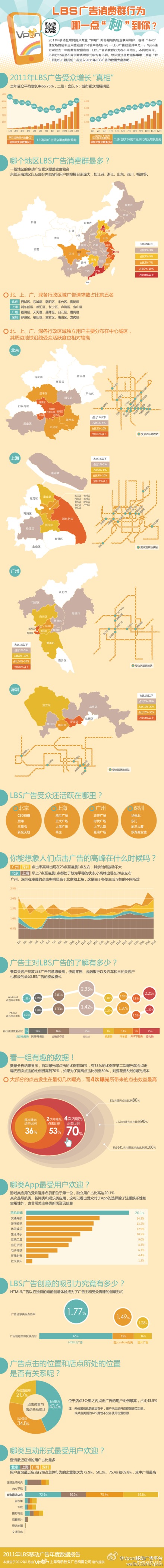 全球移动广告市场正以出乎常人想象的速度发展。在过去的一年中有超过一半的成年手机用户在商店内使用智能手机来辅助购物决策(source:Pew Research Center’s Internet&American Life Project)。与过往“慢半拍”的节奏不一样的是,这股热潮已经在中国市场蔓延。在春节长假期间,北京某电器行内iPhone 4S的日均销售量已经超过了2000台,民众将这种“不差钱“的气势在龙年延续。移动用户数量的”井喷“也带动了各种创新商业模式的发展—LBS移动广告就是其中之一。VponLBS移动广告平台通过对2011年运营数据的深度挖掘整理,在新年伊始发布了国内首个LBS移动广告行业的年度数据报告,报告显示LBS移动广告消费群在不同地区,不同时间段,不同行业甚至是不同创意表现形式中均有不同数据表现。