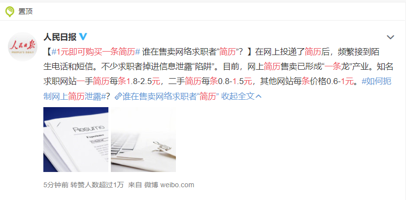 9月20日上午,人民日报发布了一条微博,曝光了个人简历泄露一事。知名求职网站上的个人简历被0.8元-2.5元贩卖出去,导致很多人接到陌生电话和短信。