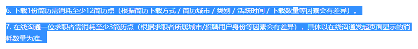 下载1份简历需消耗至少12简历点(根据简历下载方式/简历城市/类别/活跃时间/下载数量等因素会有差异)。
