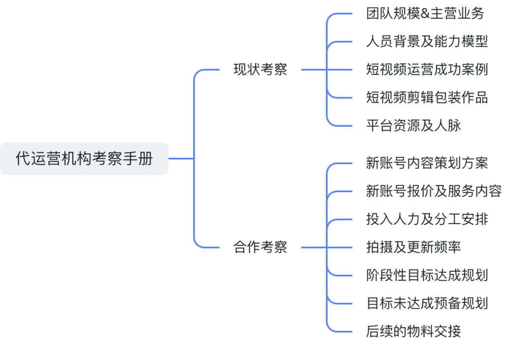 具体而言,笔者将对代运营机构考察划分为以下两个方面,通过考察代运营机构的生存现状,了解代运营机构的整体硬实力,通过合作细节的谈判,最大程度上保证代运营账号的成功概率。