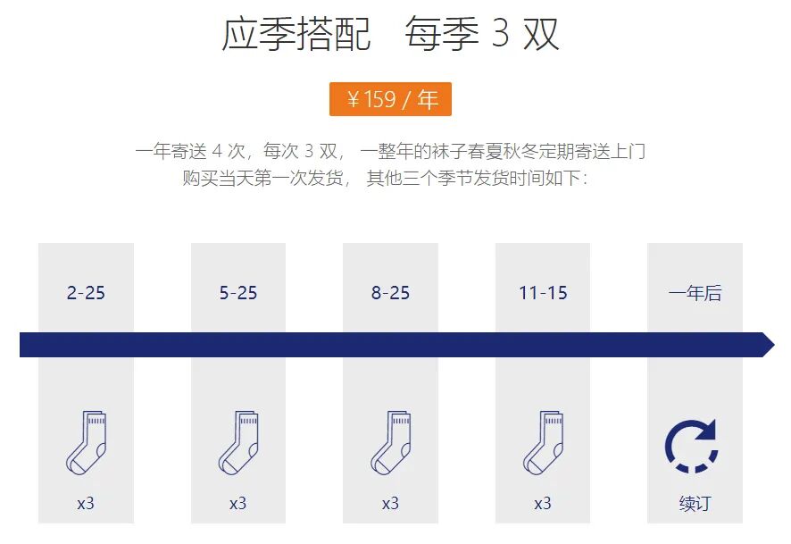 就像当年有个贼聪明的产品“男人袜”,可以选择免费试穿或体验3双39元的套装,就是突出包年、自选这样相对高价的套装!一是试穿之后觉得好,买升级版;二是对比觉得升级版更划算,买升级版!