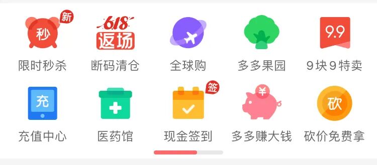 “限时秒杀”、“断码清仓”、“多多果园”、“9块9特惠”、“现金签到”、“多多赚大钱”、“砍价免费拿”,每一个都直击人性的“贪”,用大量的便宜实惠+占便宜心理吸引你的眼球。巧妙的完成第一次接触。