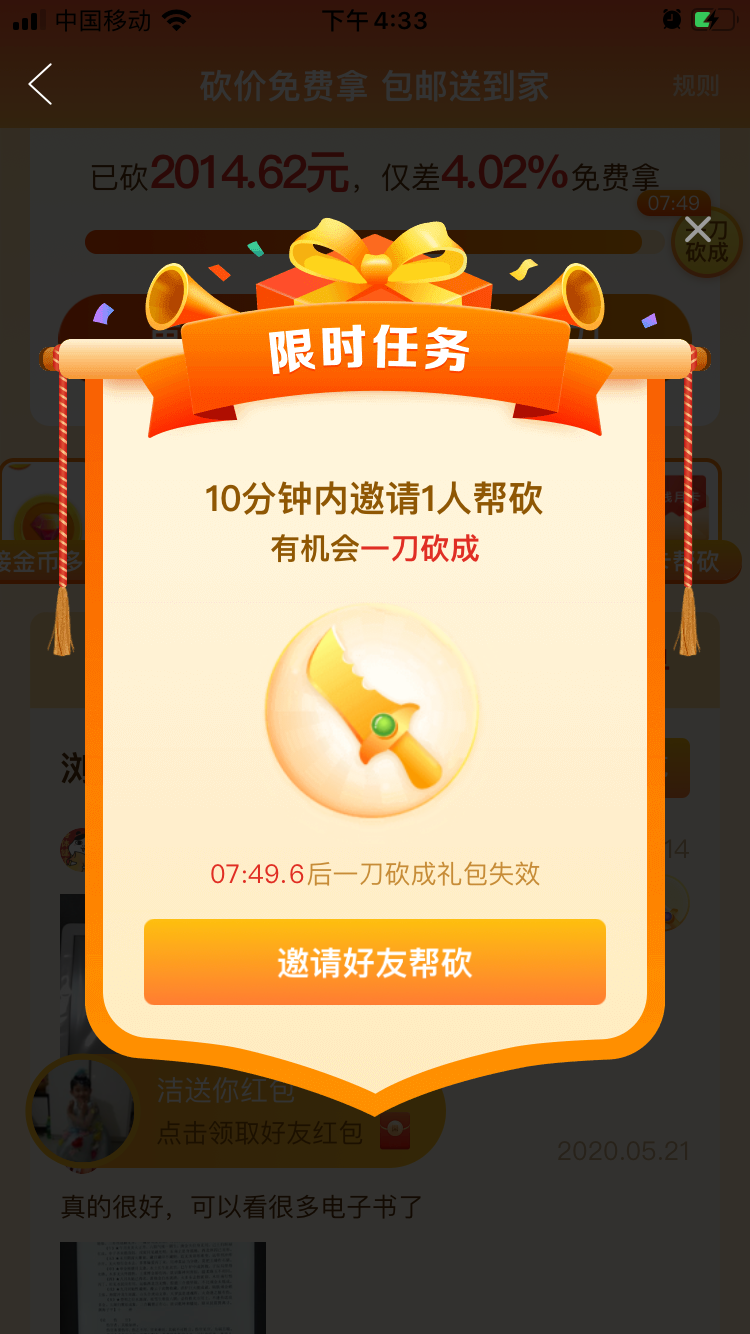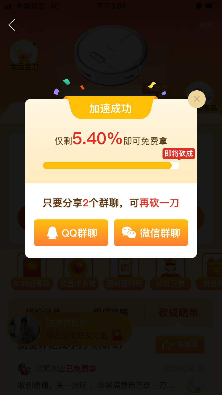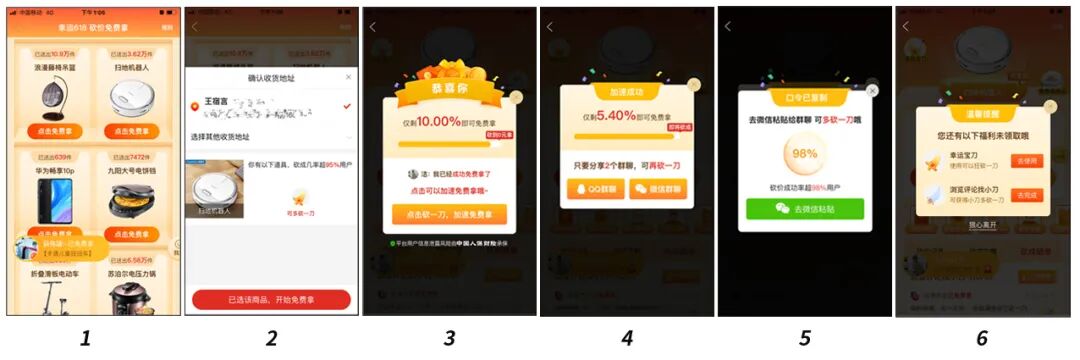 而“厌恶损失心理”在拼多多“砍价免费拿”活动后期发挥的作用会更大!当砍的金额达到1%-2%左右时,每个好友帮砍的金额也会越来越低,甚至低至0.01!在这个阶段“厌恶损失心理”就会发挥作用,如果放弃,前面的所有努力就都白费了!如果不放弃,就必须继续邀请更多人帮忙砍价!