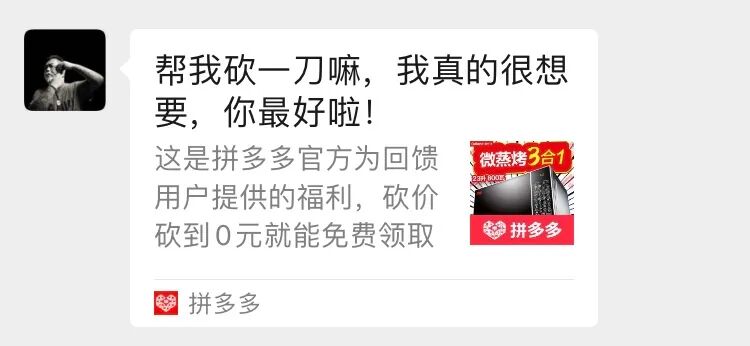 再来说说“人际型触发”,所谓人际型触发其实就是口碑传播,这一点上,拼多多可谓是玩出花来了!那些找你砍价、找你拼团的花臂摄影师兄弟、你的同事、你的二姨、你的妹妹,甚至与你10年没见过面的远方大嫂都通过拼多多找到了你!!求砍价的链接甚至从好友渗透至微信群,何况拼多多还配备了多款“求砍价卖萌文案”,让你根本不好意思不帮忙~