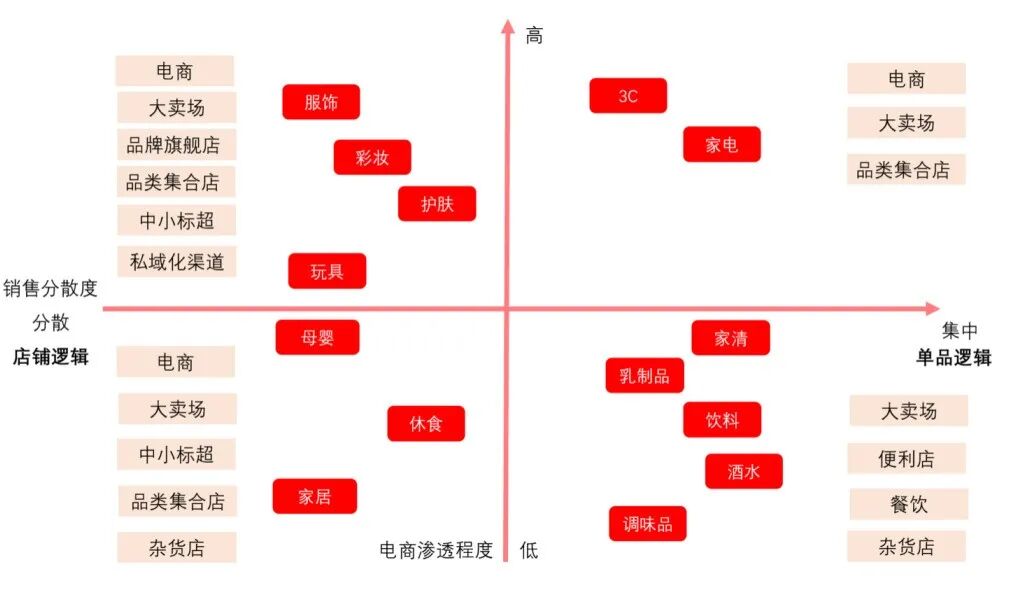 下图按品牌SKU的销售分散度和电商渗透程度,将不同类目做划分,对于销售分散度低的,通常会是店铺逻辑,不论线上线下,用户更有逛的概念,如果销售分散度高的,通常是单品逻辑,在这两种大逻辑下,爆款单品有不同作用: