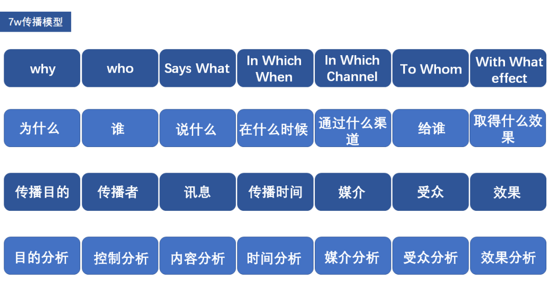下面再分享一个7W传播模型,相较于4P,7W模型关联到的维度更全面一些,二者有不同也有互补。