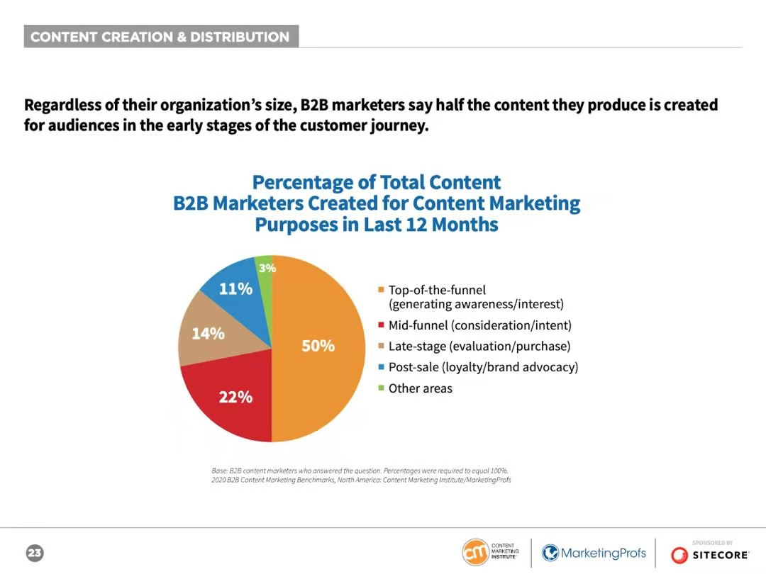 在《2020 年 B2B 内容营销报告》中,我们可以看到 B2B 内容营销人员,分别在客户生命旅程各个阶段进行内容营销的占比为: