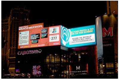 拉斯维加斯的购物中心Miracle Mile Shops,将Foursquare中 Checkin这个地方最多的用户以及用户的点评定期投放在大屏幕上。