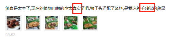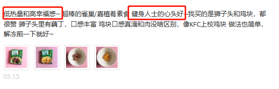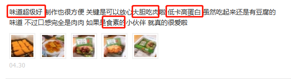 以天猫平台上的雀巢/嘉植肴植物基素食豆人造植物肉组合装产品评论中,即可通过关键词来锚定当下认可植物肉人群的特征。选取几条典型评论可以进行词语分类的相关分析: