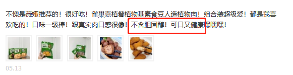 第一类词语是关于健康:健康、低热量、健身人士心头好、不含胆固醇、低卡高蛋白……