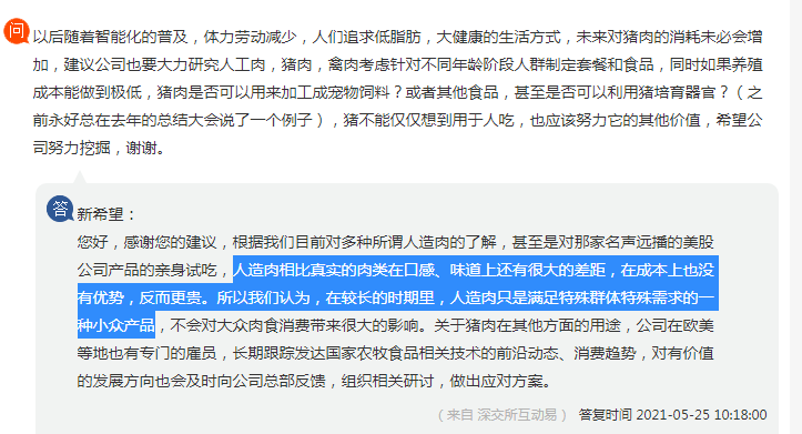 5月25日,新希望在互动平台表示,「根据目前对多种所谓人造肉的了解,甚至是对那家名声远播的美股公司产品的亲身试吃,人造肉相比真实的肉类在口感、味道上还有很大的差距,在成本上也没有优势,反而更贵。所以我们认为,在较长的时期里,人造肉只是满足特殊群体特殊需求的一种小众产品,不会对大众肉食消费带来很大的影响」。