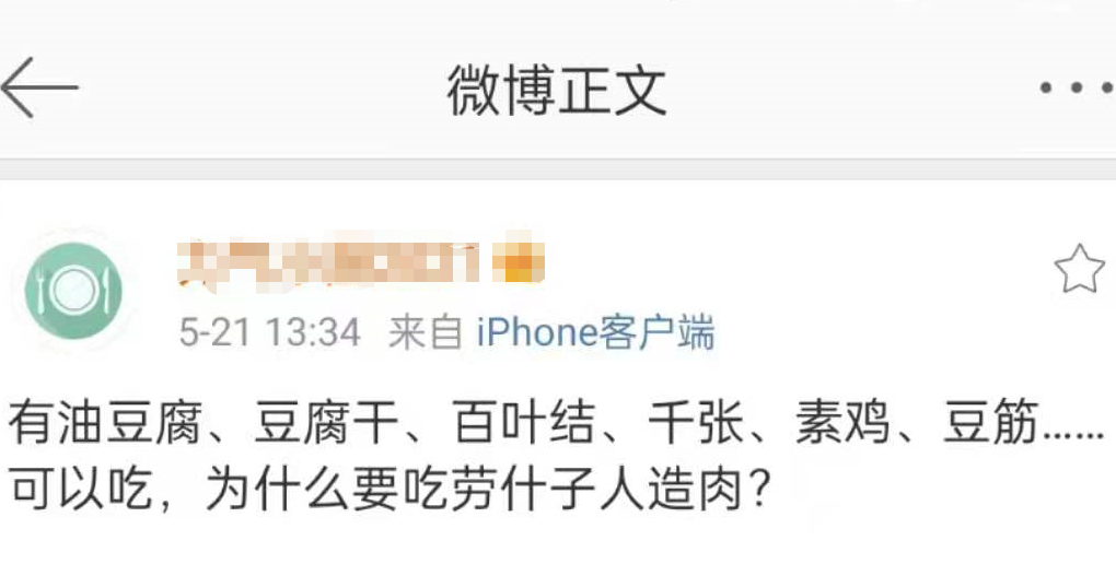 而替代也只是替代,要知道中国的饮食文化是非常复杂的,植物肉产品则更多定位西式,口味比较单一,很难满足国人的饮食需求。更有博主表示,有油豆腐、豆腐干、百叶结、千张、素鸡、豆筋……可以吃,为什么要吃人造肉?
