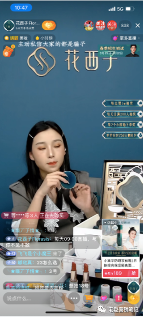 老赵带大家看几个花西子直播间的细节和一些能拿到的数据,所有的运营细节都是针对获得免费流量而设计的。