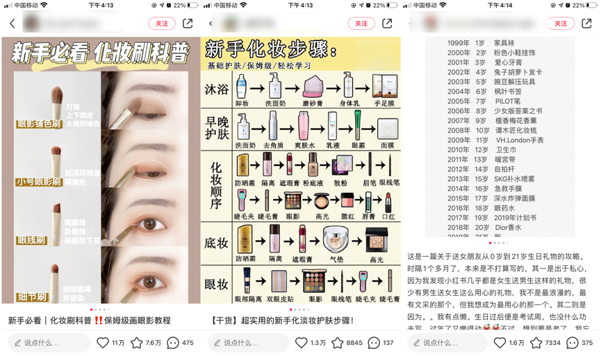 5)懂得一篇化妆教程笔记、护肤攻略笔记背后,会被即将毕业的大学生,或者出入职场的白领收藏,而且刚开始学习撸妆时,还会频繁翻出来阅读,最后记住了这个品牌。