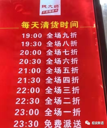 再看卖非标准品的钱大妈(不卖隔夜肉),限时折扣:8点后8折、9点后7折、12点前把菜都免费送完,保证每天的菜都是最新鲜的!