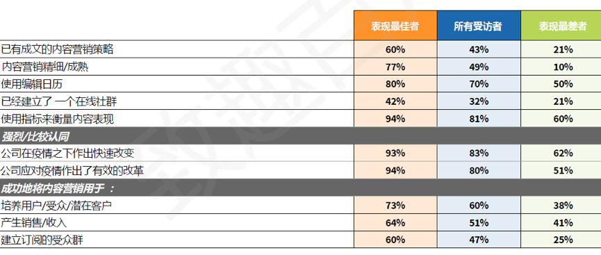 表现最佳者中,94%都使用指标来衡量内容表现,对比表现最差者,这个比例仅有60%, 也就是说,表现优异的企业更加关注内容营销的效果,在销售漏斗早期就给与更多的关注。