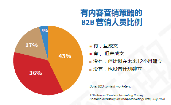 成文,未成文的有内容营销策略的营销人员比例高达79%,另外的17%目前没有,但是企业很重视,并计划在未来12个月建立,只有4%的企业没有计划建立内容营销策略。