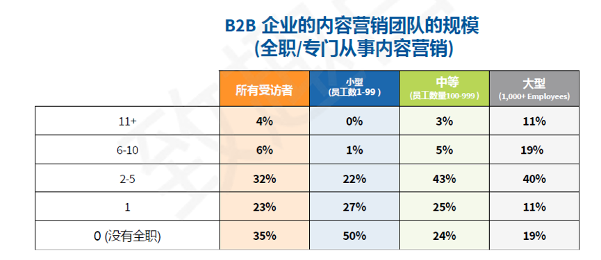 在团队的设置上,65%的企业有一个小型(包括1人) 团队专注于内容营销, 在大型企业,专门设定内容营销岗位的比例更是高达81%。在中型和大型企业,往往设有更多的人员从事内容营销工作, 通常在2-5名员工范围内。