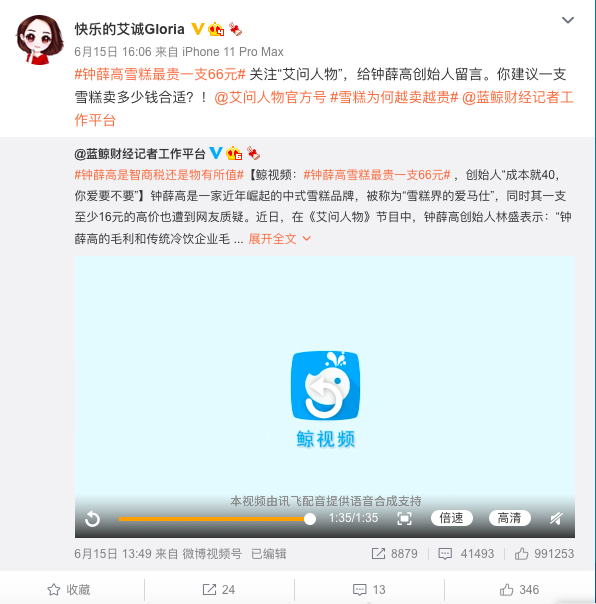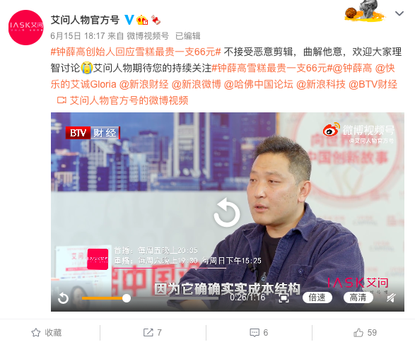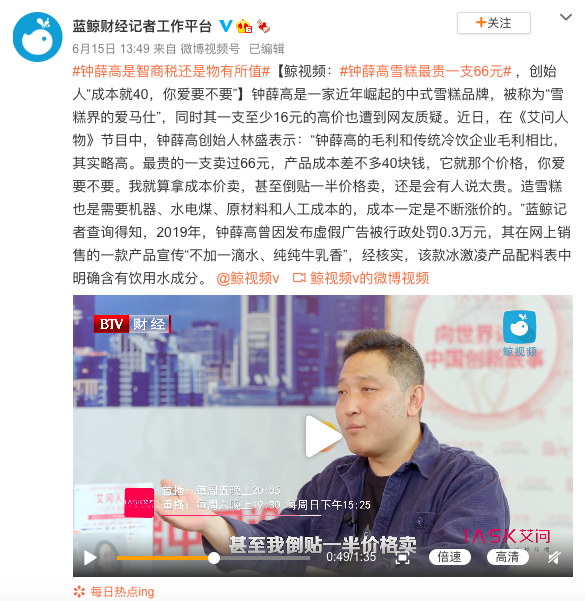 20点34分,@艾问人物官方号 微博发了一个1分42秒的短视频,实际上和钟薛高自己发的澄清视频在核心内容上是一致的,但这条视频上特意写了一句话,强调: