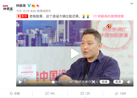 次日下午,本周三15点25分,@钟薛高 官方微博发出一个1分35秒的短视频,并配了一个文案:“老板脸黑,这个造谣大锅比脸还黑。”