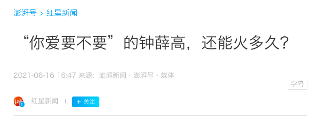 同时,更多媒体开始跟进, @红网 的标题是《“钟薛高”请放下高傲姿态”》,@红星新闻 则是《“你爱要不要”的钟薛高,还能火多久?》。