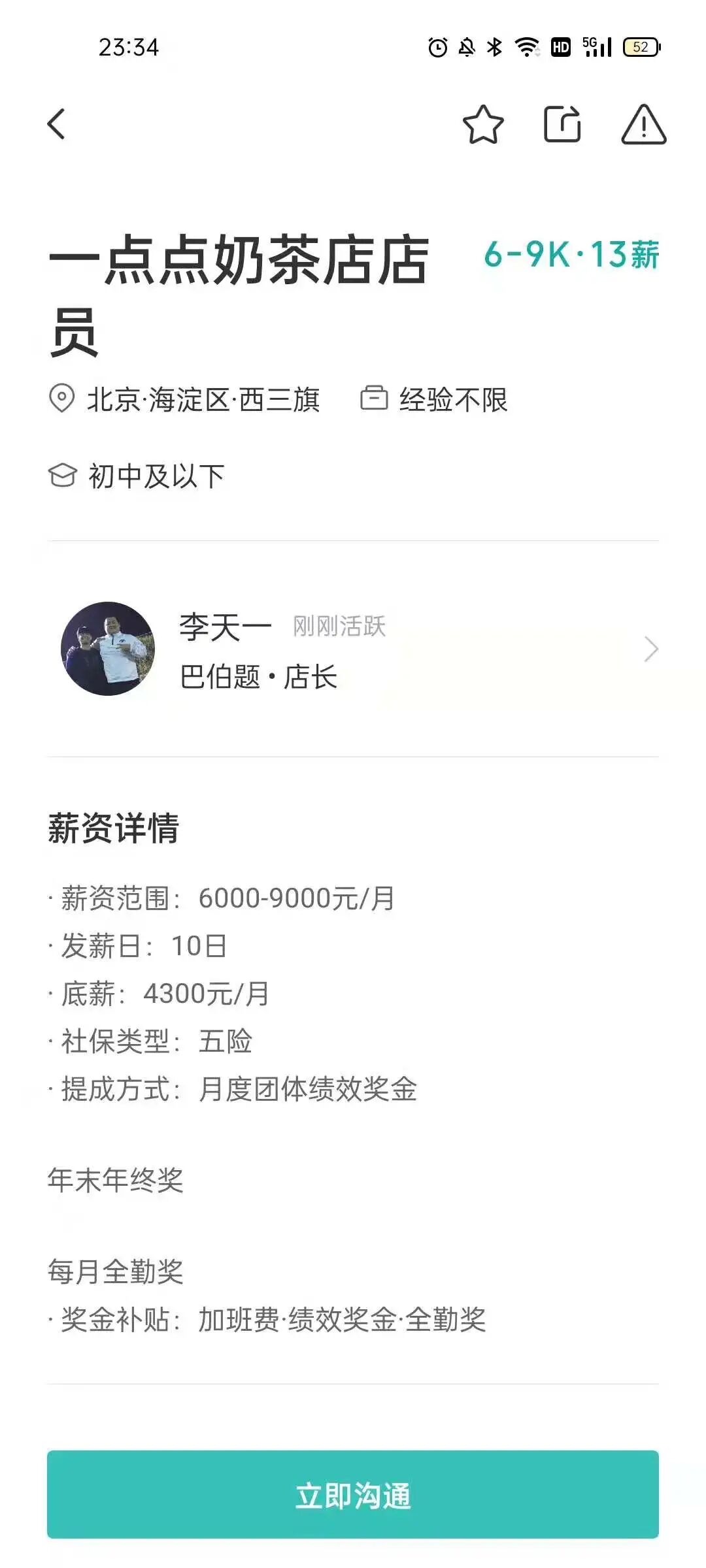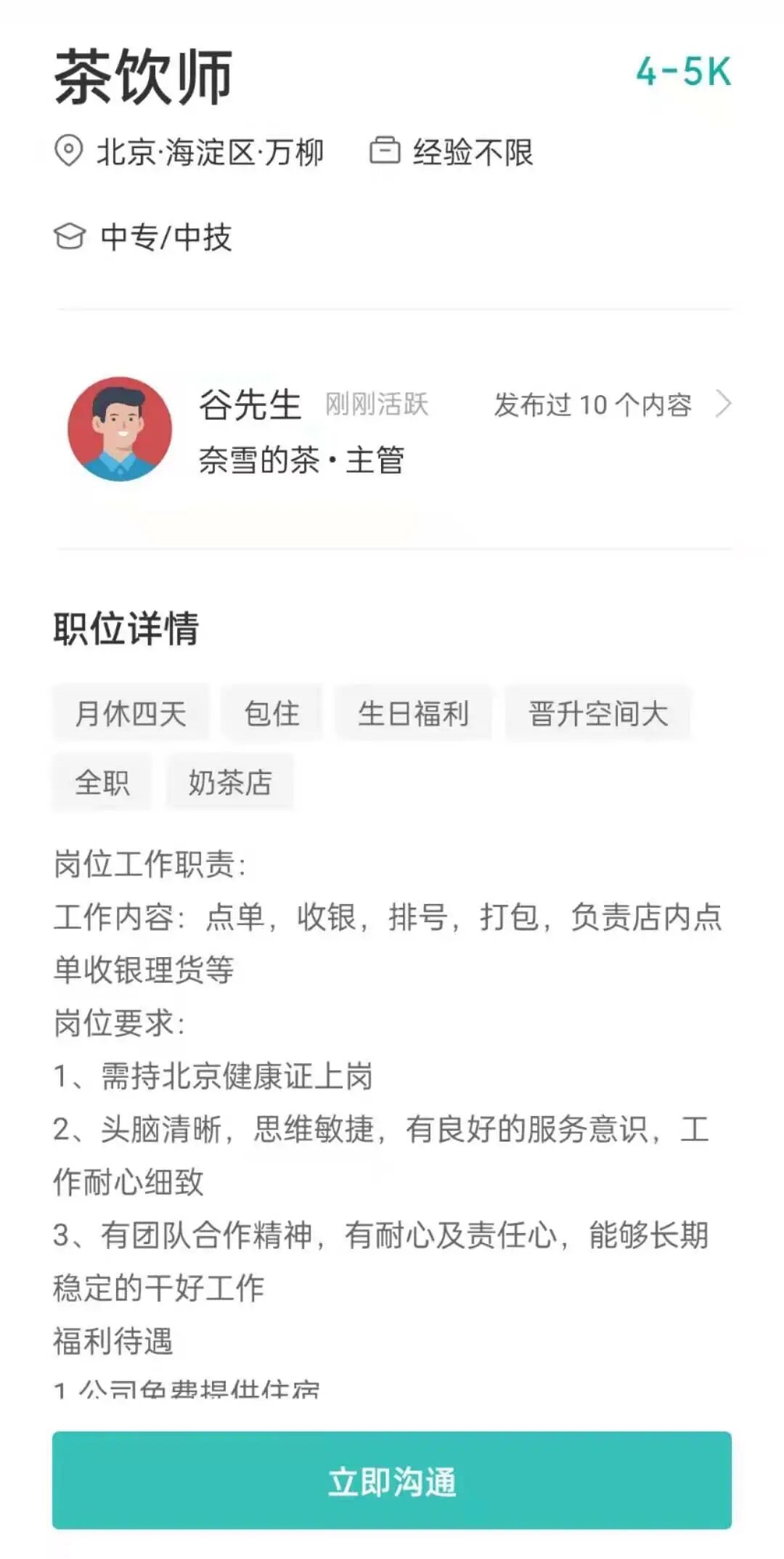 再看看同行。不难发现,一点点的奶茶店员招聘条件写得甚至要比奈雪更好,6-9k。可见,虽然产品高出平均价格,但人力的价格并没有更高。