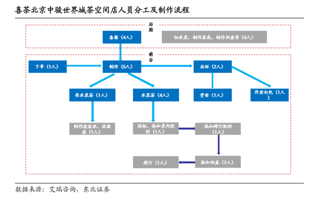 还是流程问题。先看制作流程,一杯讲究的新茶饮制作,需要多个SOP(标准作业程序)。以喜茶为例,仅饮品制作就需要有5个岗位,还不包括餐前水果的质检与处理、下单、制作完毕的出杯与打包。
