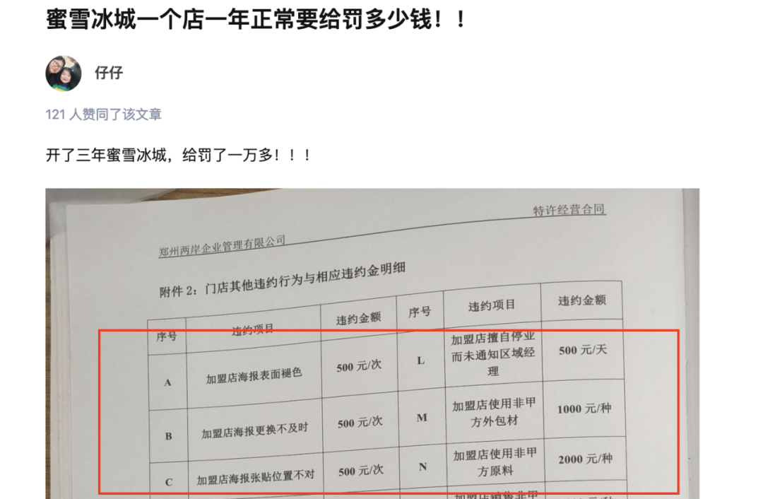 树立规矩过后,由各区域经理执行。在知乎可以看到有加盟商晒出经营合同,一些经营小细节不达标,蜜雪冰城即可对门店进行「违约」罚款,甚至海报张贴位置不对也要罚款500元。