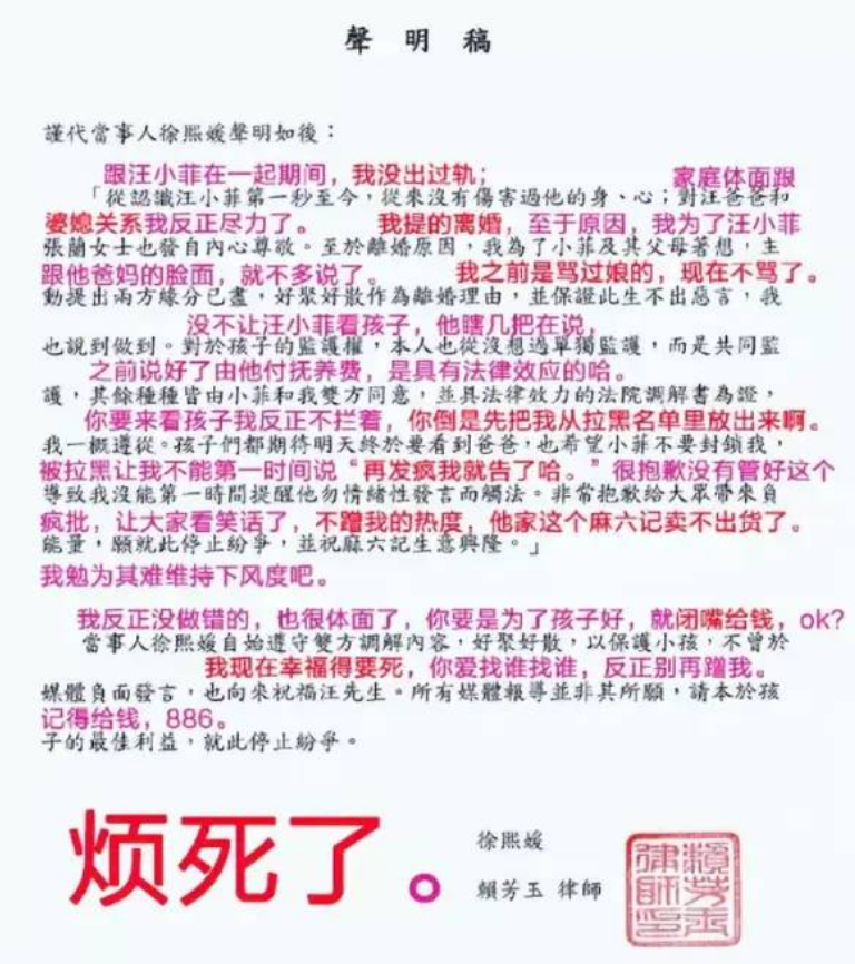 即便是那篇以她本人名义发出的声明稿,也是以情叙事、简明扼要、通俗易懂,不仅没有指责任何一方的过错;还表达了她希望事情和平解决的心情。