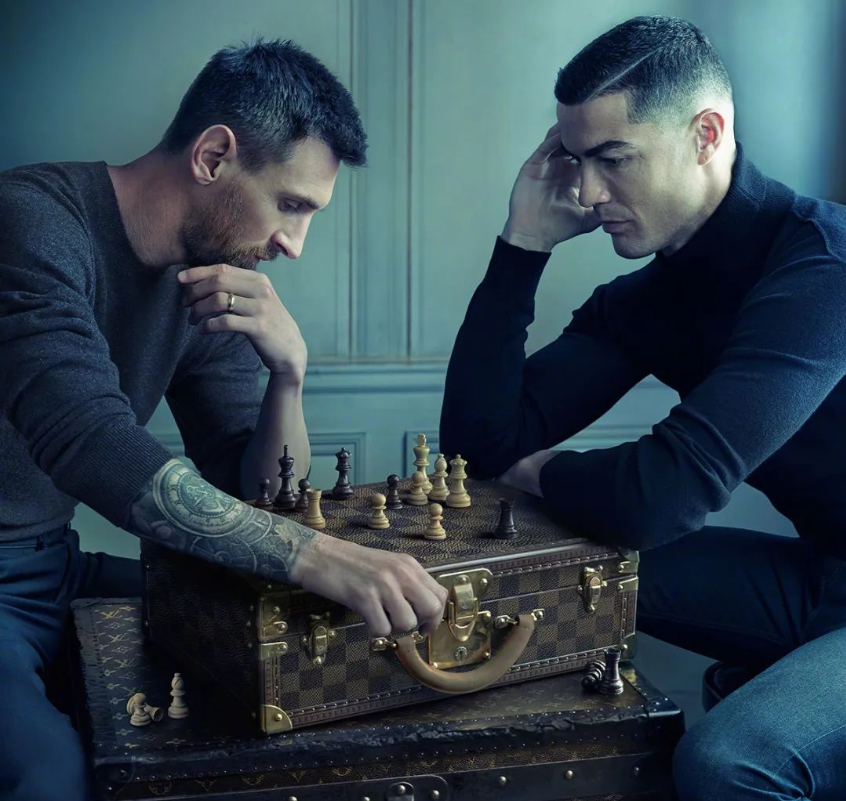 画面中,梅西和C罗相对而坐,以LV经典的印花皮箱格纹为棋盘,进行着国际象棋的较量。