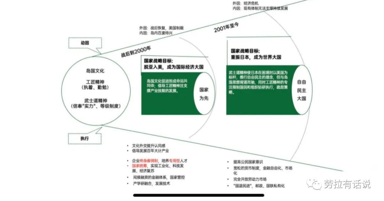 从日本的案例中我们可以获得启示:受竞争环境、自身升级等动因的驱动,不同阶段会衍生出相应的文化(意识形态),但不能偏离底层逻辑方向——价值观(民族精神)。