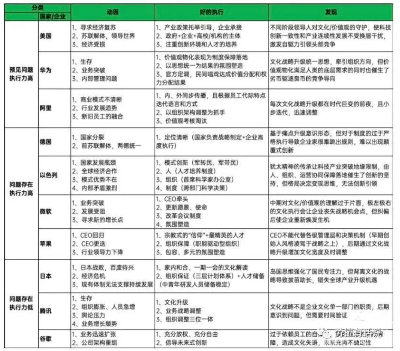 可以看到:文化价值观的提出或升级往往与地缘政治、竞争环境、领导人变更、内部矛盾、模式或制度失效、发展受阻、提升影响力有关。借鉴这4个国家和6家企业的成功与失败,好的执行包含执行模式、组织保障、文化、价值观一致性、人、制度和机制、CEO参与度、沟通传播(内外同步)、奖惩机制/淘汰机制、氛围塑造等10要素。