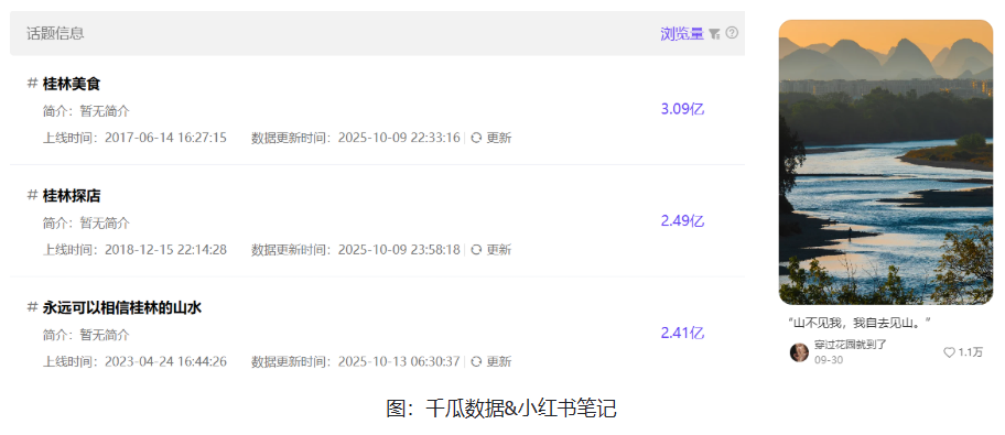 桂林“漓江竹筏+龙脊梯田”的经典组合持续霸榜,但用户内容已从“游客照”转向“清晨6点的山水冥想”、“来桂林不嗦粉等于白来”。数据显示,#桂林美食、#永远可以相信桂林的山水 话题浏览量分别为3亿+、2.4亿+,相关笔记点赞破万。