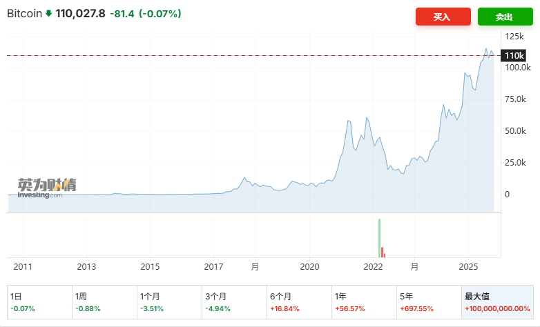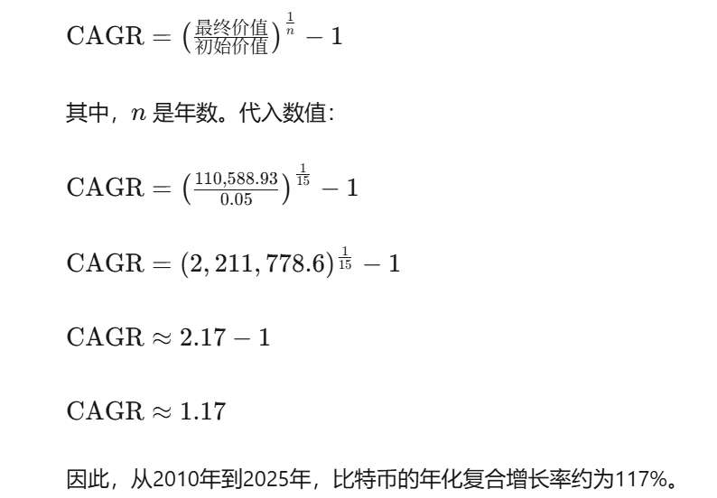 坊间有人做过统计,如果从最早2010年公开市场记录的比特币价格0.05美元开始计算,持有到2025年10月,比特币的价格约为110,000美元。那么比特币的复合增长率约为117%。