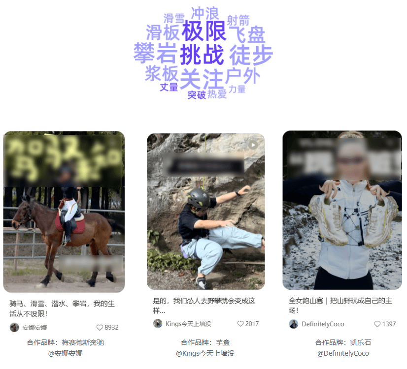 攀岩、飞盘、陆冲等轻运动之所以在小红书持续风靡,核心在于它们能带来即时身体反馈。结合千瓜数据-关键词分析显示,围绕“极限、挑战、突破、力量”展开营销。