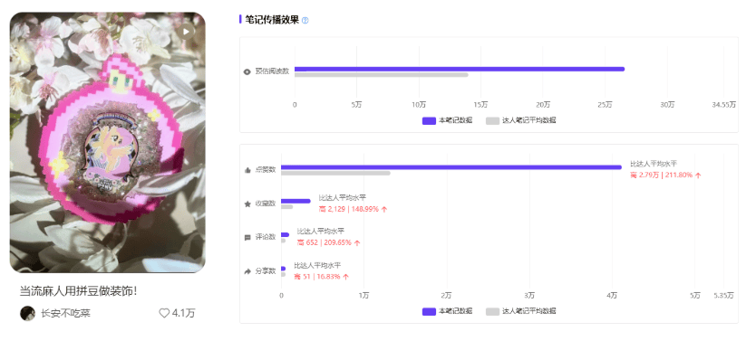这种从无到有、将想法亲手变成实物的过程,能给年轻人带来久违且真实的创造成就感。不少小红书达人也在不断创新玩法,例如@长安不吃菜 打造的流麻款拼豆,梦幻联动热门 IP,让手作更具趣味性与传播力。千瓜数据显示,笔记点赞数高于达人平均水平 ,足见种草的成效。