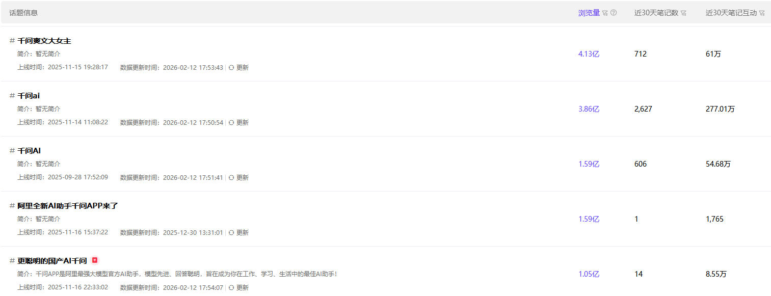 千瓜数据显示,千问相关的话题在小红书热度惊人,# 千问爽文大女主 热度高达 4.13亿,# 千问 ai 3亿+、# 千问 AI 1亿+,而 #阿里全新AI助手千问APP来了 等话题也获得广泛关注。数据背后,是年轻人对 AI 的全新认知与情感连接。