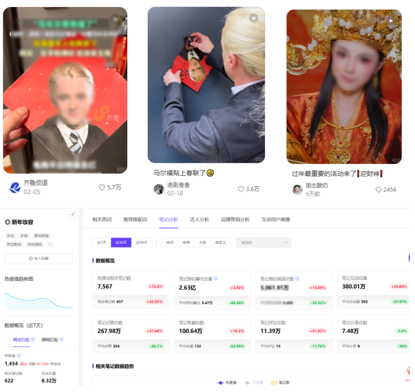 千瓜数据显示,近30天“新年妆容”预估互动达380万+,但大家不化招桃花的妆了,全在化“财神妆”、“财神OOTD”。更绝的是,趁着马年,把《哈利·波特》和福字结合的“马尔福春联”火到了外网,相关话题浏览量500万+。