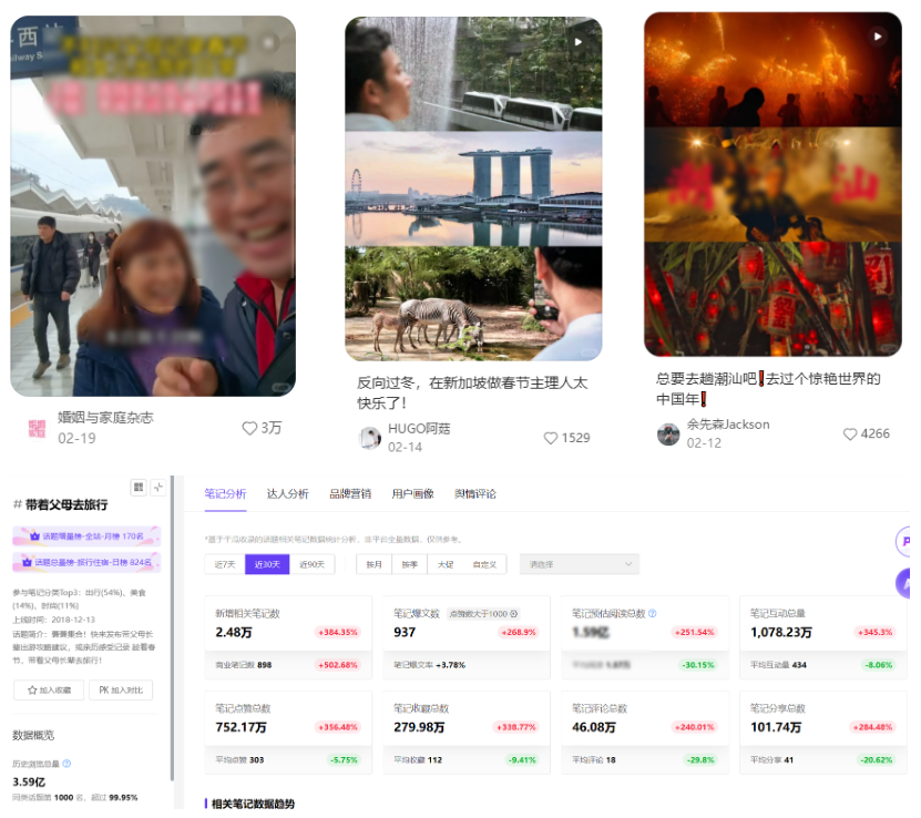 今年大批年轻人选择把父母接到自己工作的城市“反向过年”,或者干脆全家打包去泉州看簪花、去潮汕看英歌舞。千瓜数据显示,春节期间 #带着父母去旅行 笔记数暴增384%+,预估互动达千万级。